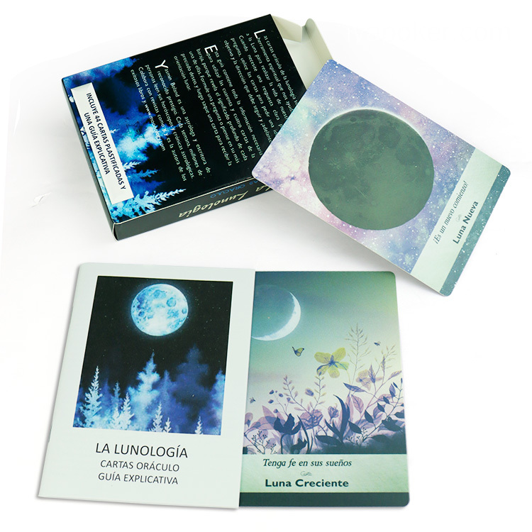 FSC paper stock, High Quality inks, and custom tuck boxes or rigid boxes with spot UV, foil stamping, or embossing. Add booklets, guidebooks, or numbered inserts for a complete tarot set.